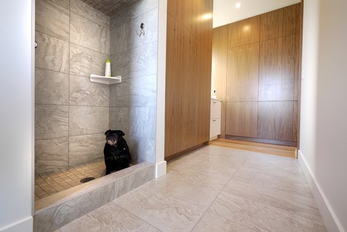 If your hallway is wide enough you might be able to squeeze in a dog bath near the backdoor. In the photo below a large dog washing station is tucked in behind the half bath near the back entry. The dog shower is extra-large to accommodate the homeowner’s St. Bernard.