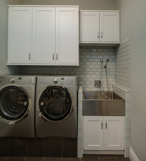 In this laundry room a dog wash station was created using an industrial mop basin and commercial style faucet on a raised cabinet. The additional cabinet provide ample storage.