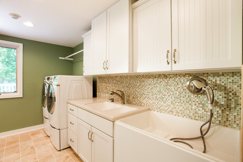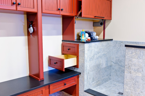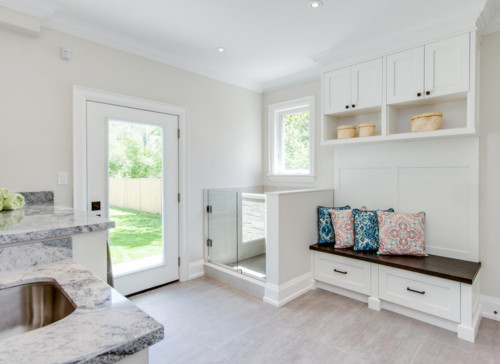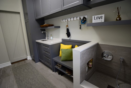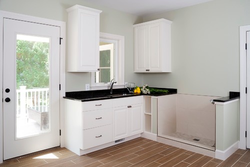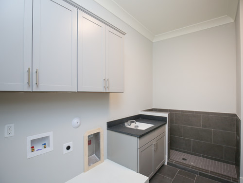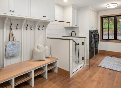 We installed our dog wash station in the mudroom/laundry room. This location offered convenient access to existing plumbing and allowed us to bathe our dog before she entered the rest of the house, helping keep our home clean. Below is a photo showcasing a spacious laundry and mudroom that includes a dog shower in the corner.