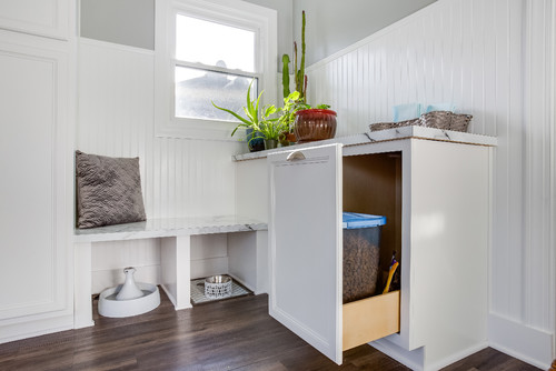 Across the entryway, another bench incorporates a cozy space beneath it, perfectly sized for the pup’s bed.