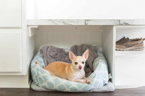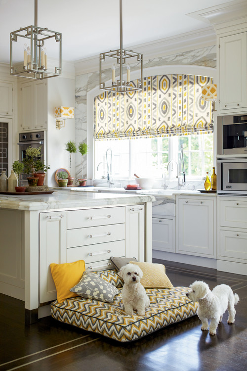 Nestled next to the large center island of a beautifully appointed kitchen, a dedicated space for a large dog bed seamlessly integrates into the room’s overall design. The dog bed features an elegant chevron pattern that subtly compliments the color scheme of the nearby window coverings, creating a cohesive and stylish look.