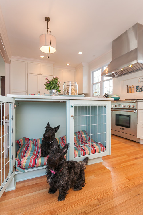 In this elegant white kitchen (below), the light blue center island stands out as a focal point, offering both style and practicality. One side of the island features a built-in dog crate designed for the owners’ two Scottie dogs, blending seamlessly with the kitchen’s decor.
