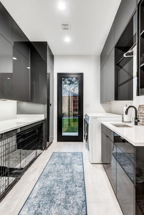 This next laundry room showcases a modern and sophisticated design, featuring sleek, shiny black cabinets paired with pristine white countertops, creating a striking contrast. On one side of the room, are two wire dog crates seamlessly integrated into the design, providing a stylish and secure space for pets.