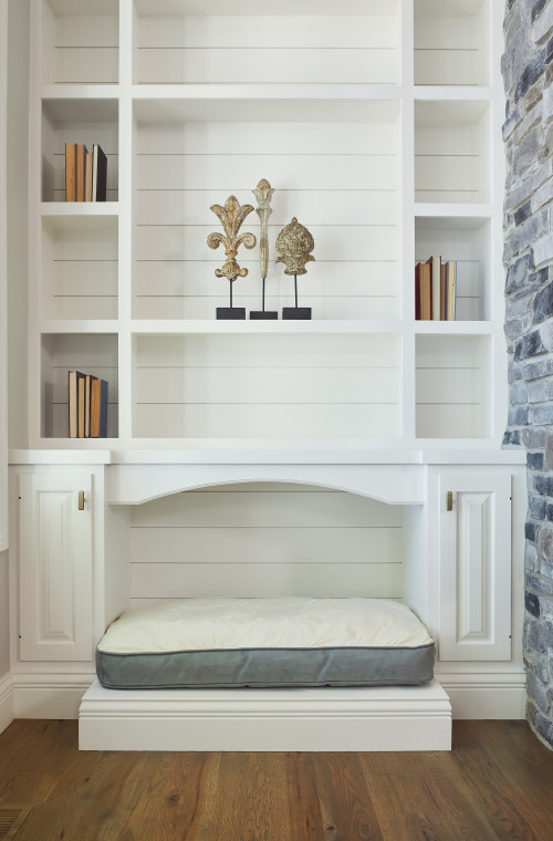 The dog bed itself is elevated and adorned with a plush cushion, offering a comfortable and luxurious resting place for the family pet. Above the bed, open shelves provide space for decorative items or pet accessories, enhancing the overall aesthetic.