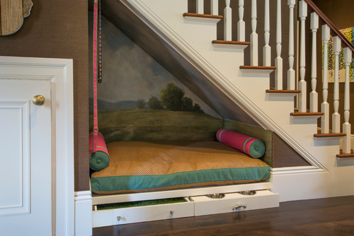 The next photo showcases a luxurious dog bed ingeniously built under the stairs, transforming a typically unused space into a lavish retreat. This cozy nook features a stunning mural of a serene landscape, creating a tranquil backdrop for the pampered pet.