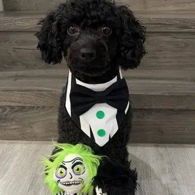 Step into the whimsical world of BeetleJuice with this stylish dog tuxedo, featuring a black and white bandana that captures the iconic look of the character. This Halloween-ready accessory comes with a snap closure for easy on and off.
