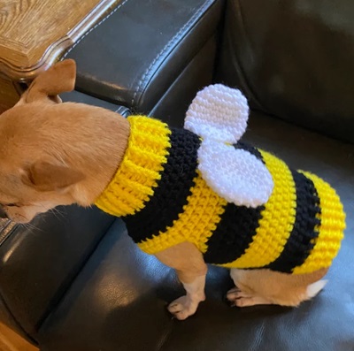Buzz into style with this Bumblebee Dog Sweater, perfect as both a cozy layer and a playful Halloween costume! Each piece is hand-crocheted, available in four distinct sizes to fit a variety of small dog breeds.