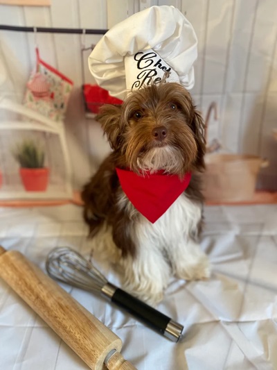 Whether you’re coordinating with the “Cookies and Milk” theme above for multiple pets or simply dressing up your solo pup, this customizable chef hat and red scarf set is a charming choice.