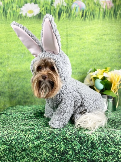 Hop into cuteness with this custom-made gray Bunny costume for small breed dogs! Designed to melt your heart, this costume features adorable pink inner ears and a fluffy white tail. It’s a full costume crafted for both comfort and style, complete with stiffened ears to maintain their upright bunny shape.