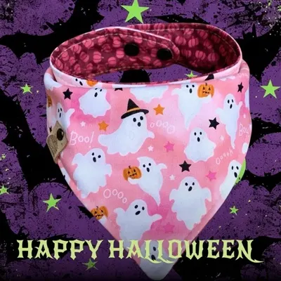Ideal for dogs who shy away from full costumes, this pink Halloween bandana with whimsical ghosts is a simple, stylish alternative. Made from 100% cotton, it offers comfort and festive flair without the fuss. Available with or without a personalized monogram.