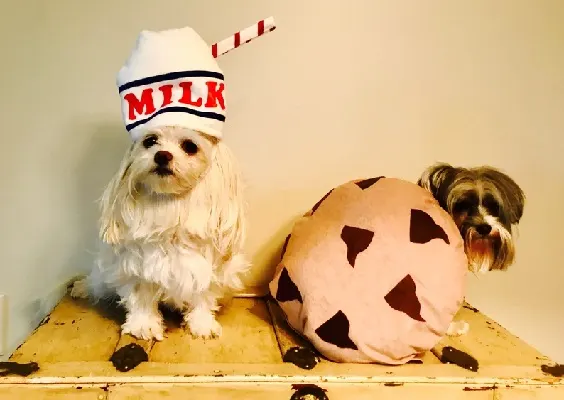 Discover these delightful Milk and Cookie dog costumes, a sweet treat for your furry friends this Halloween! While the costumes shown above are designed with smaller dogs in mind the creator Sew Dog Gone Creative also has listings for larger breeds. See below.