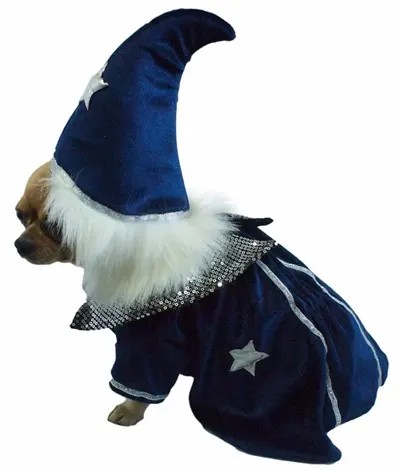 Transform your dog into a mystical wizard this Halloween with this enchanting wizard costume. Crafted from blue velvet and accented with white faux fur, this coat features silver stars that add a magical touch.